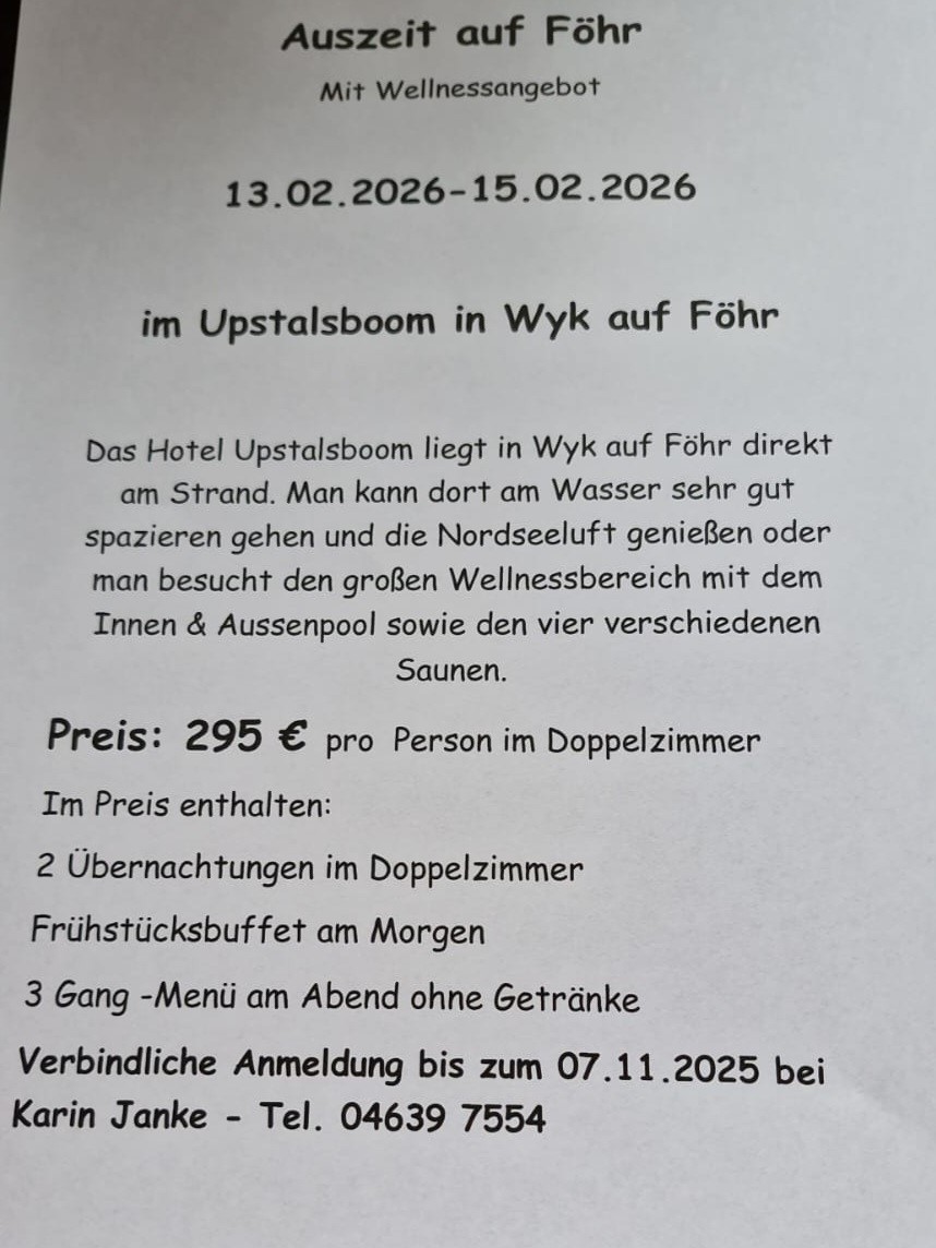 26.2.26-27.2.26  Fahrt nach Föhr                          Der LandFrauenVerein Schafflund hat noch Plätze frei. Anmeldung bis 18.11.25 bei Karin Janke.