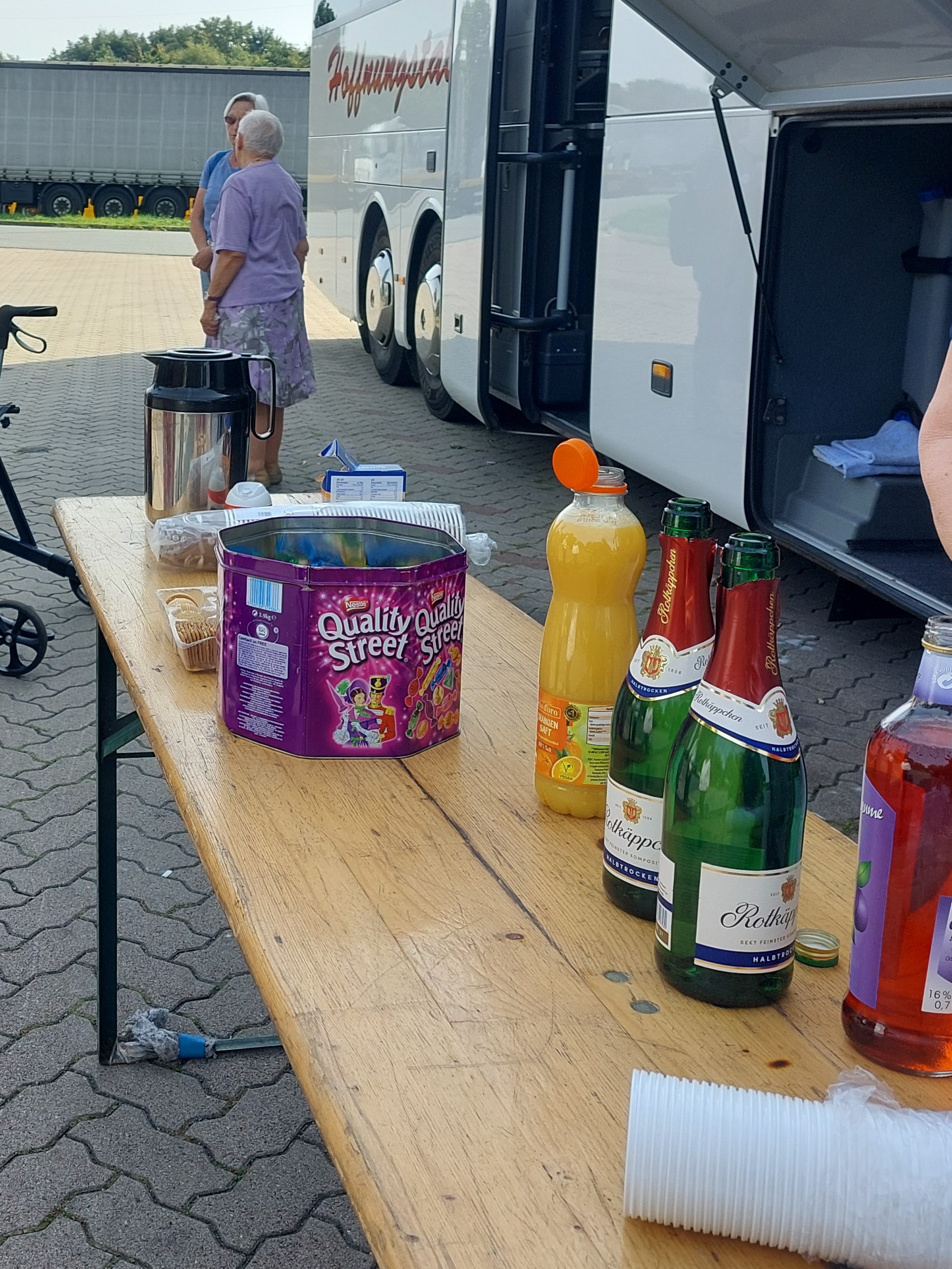 es ist warm, wir haben Durst und Pausen auf Rastplätzen gehören zu einer Busreise einfach dazu: unsere Reiseleiterin Inken hat da mal was vorbereitet.